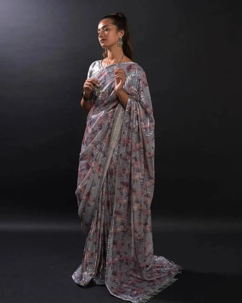 This exquisite georgette saree boasts stunning 3MM sequin embroidery that adorns both the saree and blouse.