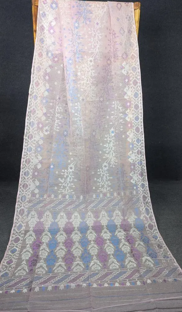 This Jamdani saree exemplifies the meticulous skill required in its creation, with its intricate patterns seemingly floating on the sheer fabric.