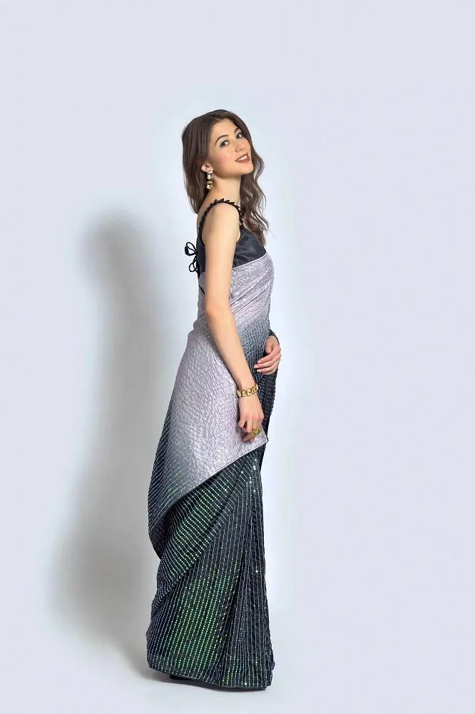Intricate sequin embroidery graces the piping from border to border, creating a dazzling display.