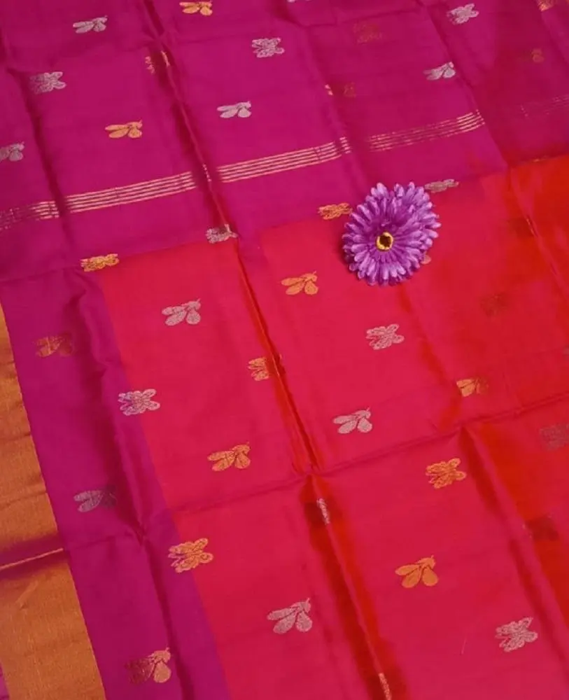 The vibrant Rani Color silk is adorned with patterns reminiscent of the sacred flower, infusing the garment with cultural significance.