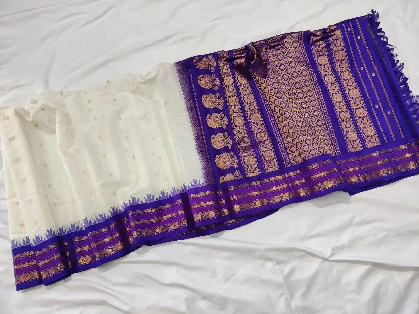 A striking maroon border with intricate golden temple designs frames the saree, adding a touch of regal splendor.