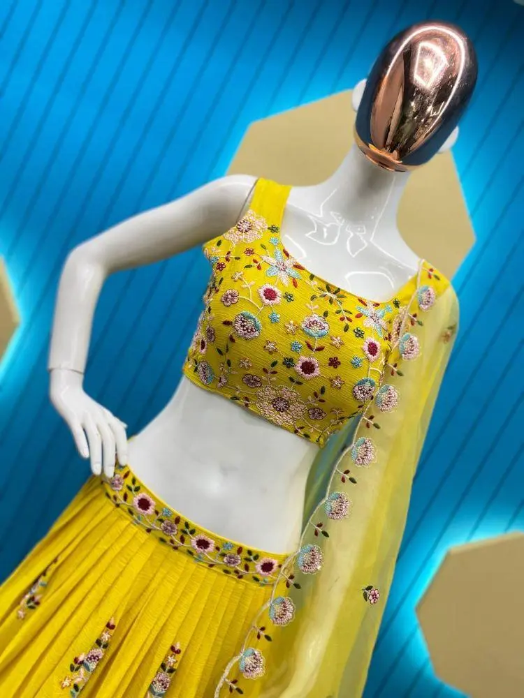 This yellow lehenga choli showcase exquisite lehenga cholis crafted from chinon silk, featuring intricate floral embroidery.