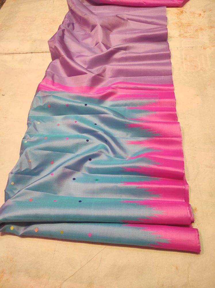 This Gadwal Handloom Pure Silk Saree showcases a magnificent big temple border with intricate butta weaving, exuding heritage craftsmanship.