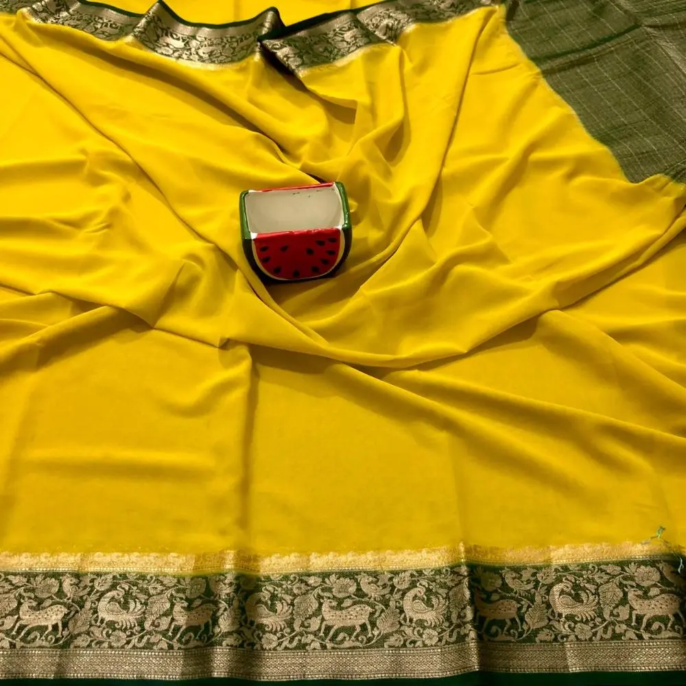 Introducing our Glassy Kanchi Chiffon sarees, featuring exquisite Kanchi borders and a distinctive chit pallu.