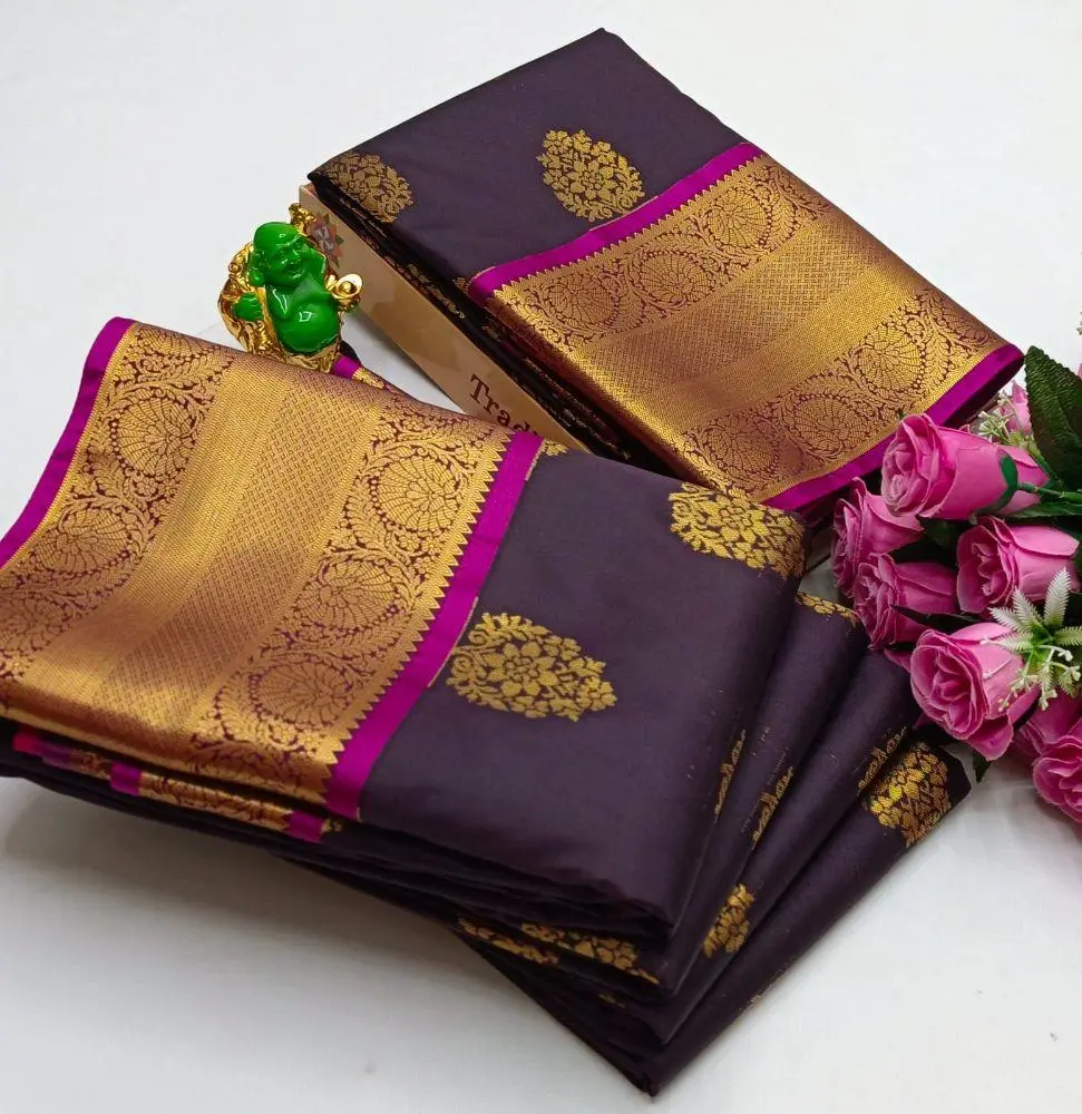 This elegant saree features a grand Jari design with a striking contrast pallu and blouse.