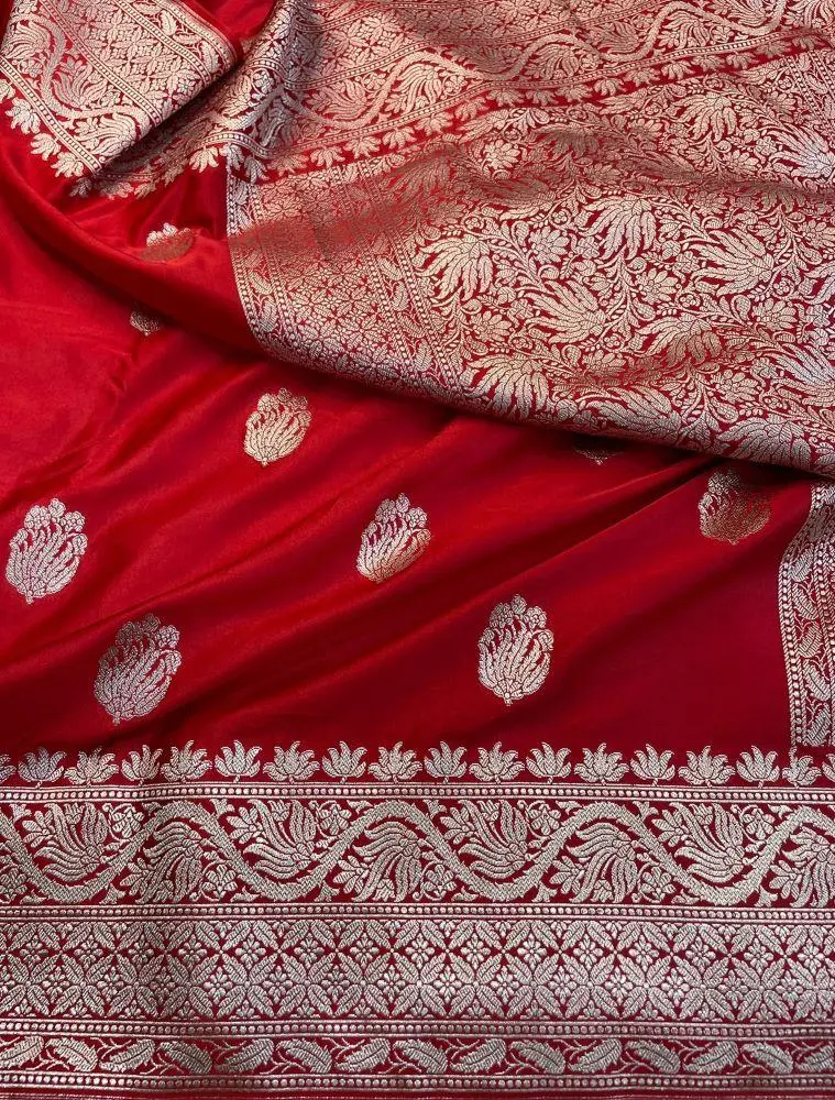 This exquisite red Banarasi mashru silk saree embodies the essence of luxury and tradition. The high-quality pure silk fabric shimmers with a subtle luster, showcasing the unique characteristics of mashru weaving.