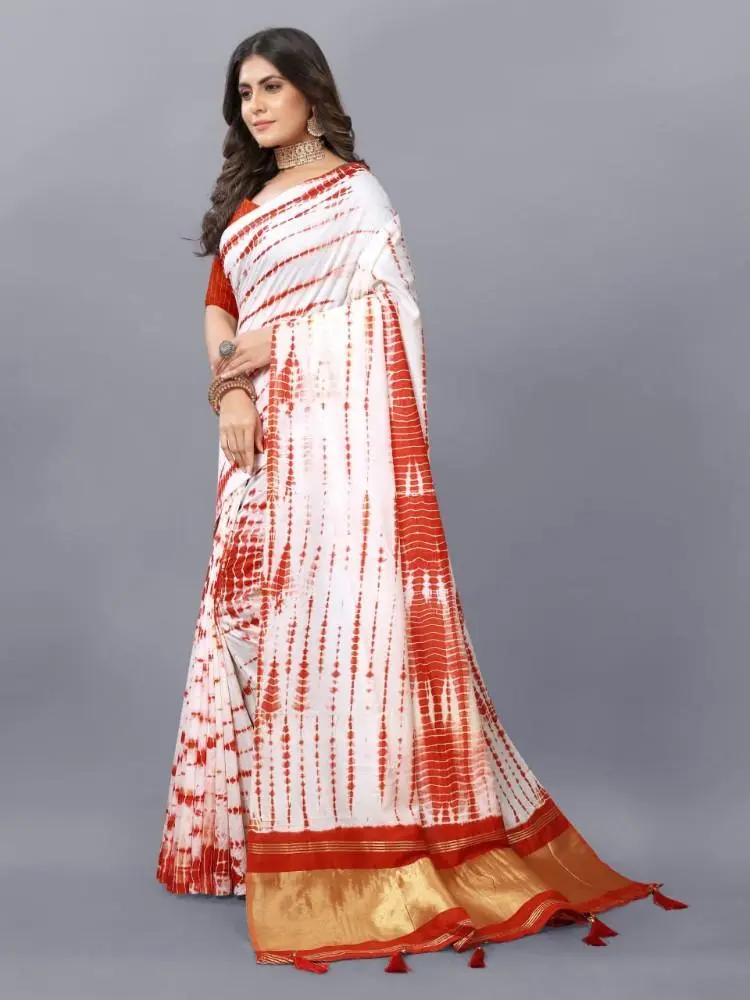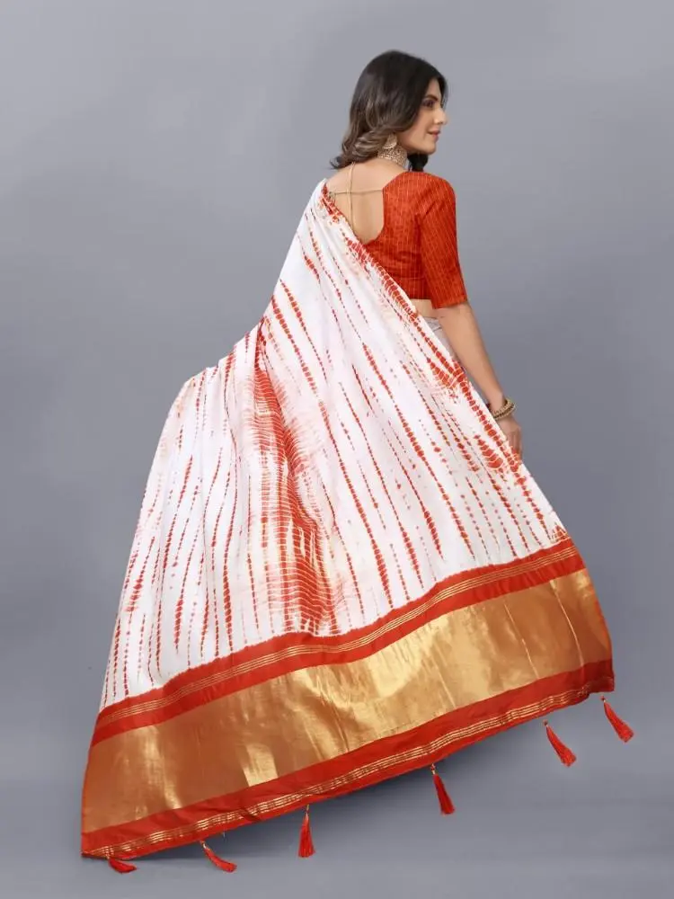 The Shibori Saree features a captivating Bandhani Print, blending two traditional dyeing techniques to create a unique and vibrant design.