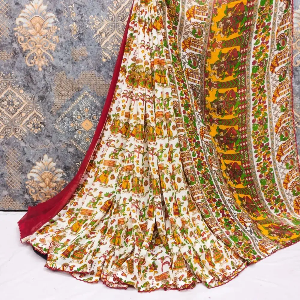Designer Georgette Saree With Vibrant Kalamkari Design And Arko Work In White Code : YNSGGMKD87WH2