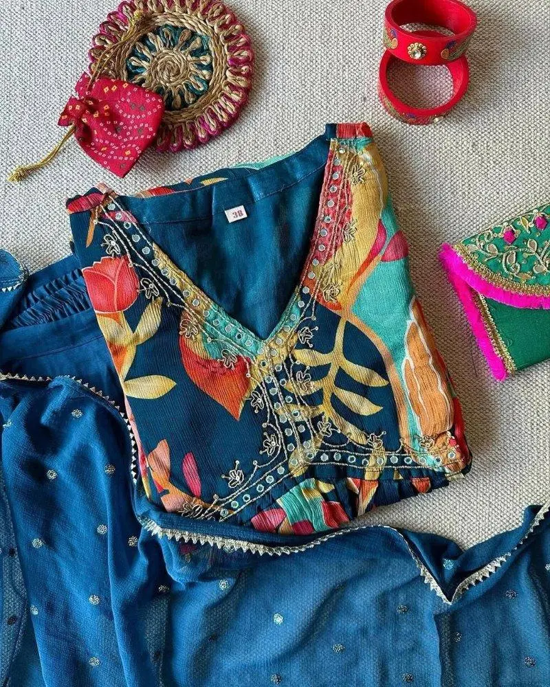 Available in sizes M(38), L(40), and XL(42), each piece is tailored to complement your body shape, offering a perfect fit that enhances your confidence and style. The accompanying crepe pant with elastic provides flexibility and a flattering silhouette, while the luxurious faux georgette dupatta, adorned with exquisite sequin work and fancy lace, adds a touch of glamour to complete your ensemble.