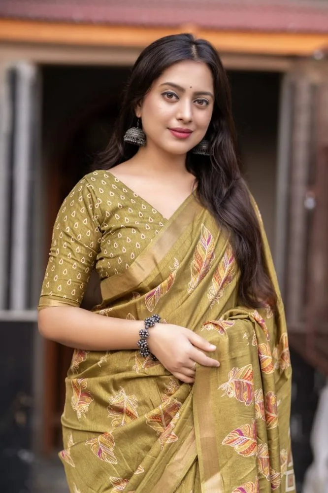 This soft crape saree comes in a subtle dusty color range, adorned with fancy leaf prints and a zari pattu border.