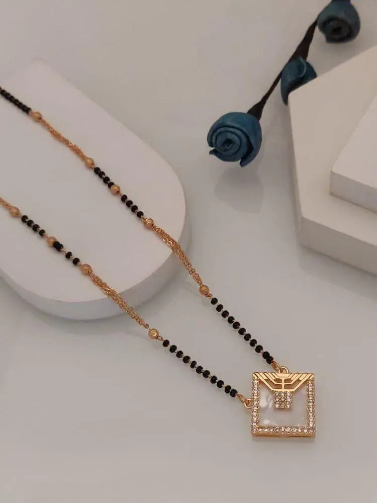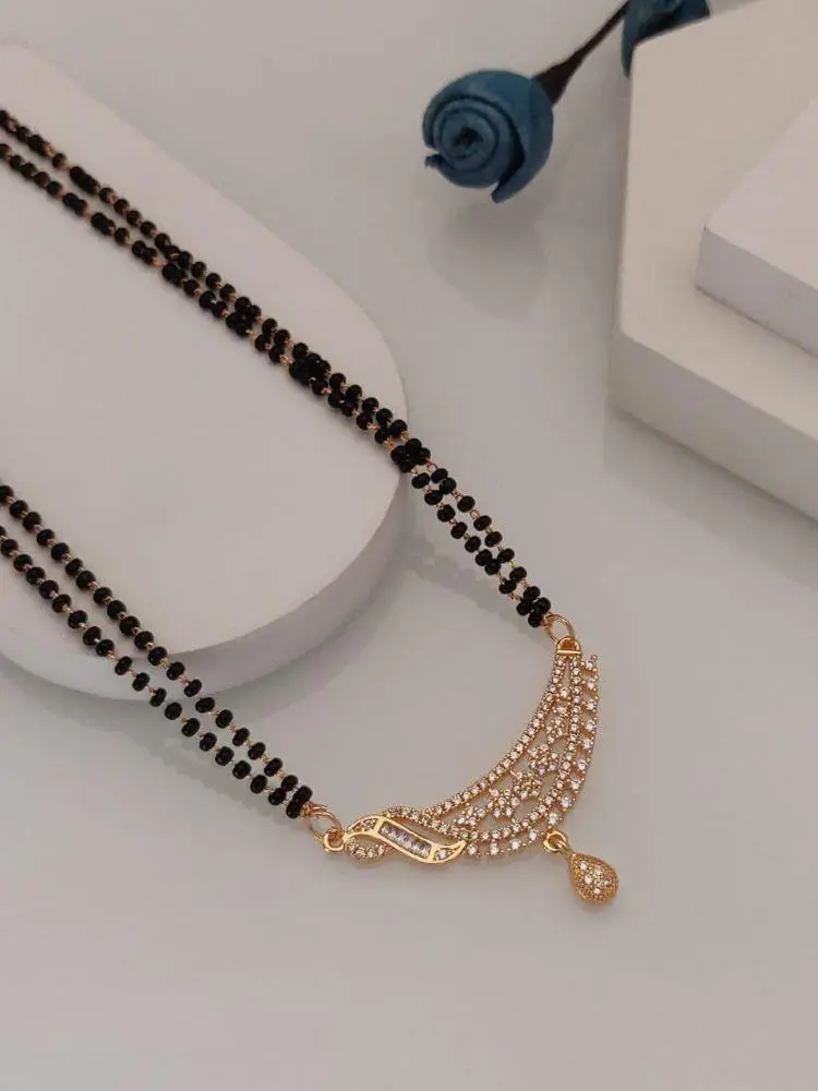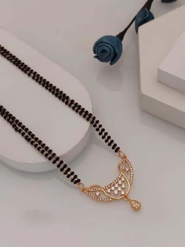 This elegant mangalsutra features a delicate rose gold-plated chain adorned with sparkling American diamonds.