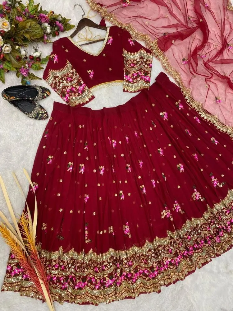 This Elegant Faux Georgette Lehenga set embodies grace and sophistication, making it perfect for festive occasions. Crafted from high-quality faux georgette, it offers unparalleled comfort and fluidity. The intricate sequin embroidery throughout the lehenga and matching choli adds a captivating shimmer, beautifully capturing the light. A lightweight net dupatta completes the ensemble, enhancing its elegance and ensuring a regal appearance for any special event.