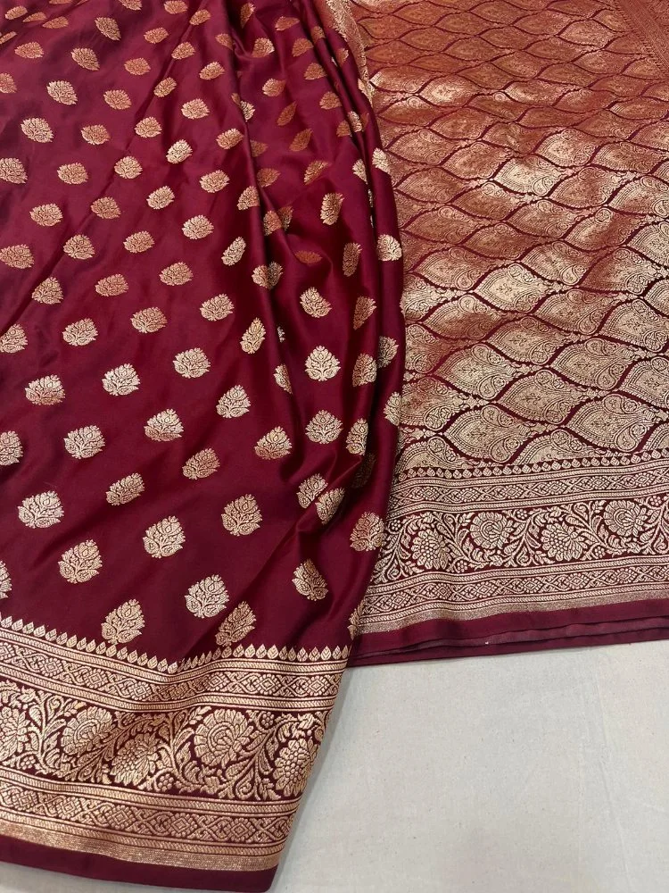 Indulge in the elegance of this high-quality Mashru Silk Saree, adorned with an allover booties design that adds a touch of sophistication.