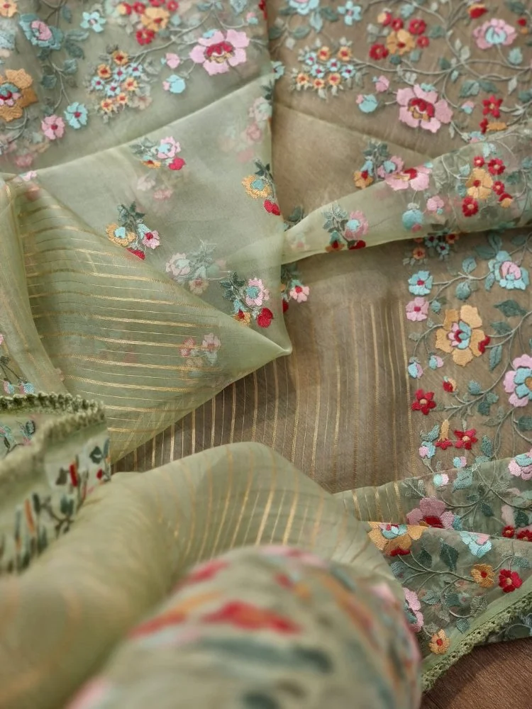 This elegant pure organza silk saree features delicate handwoven floral embroidery and luxurious velvet lace trim.