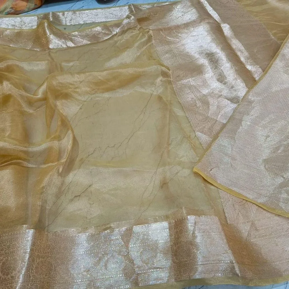 Elegant Pure Tissue Silk Saree With Lace Border And Rich Brocade Blouse In Golden Color Code : MJSTISK7200GO