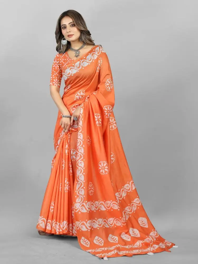 The Shibori Saree features a captivating Bandhani Print, blending two traditional dyeing techniques to create a unique and vibrant design.