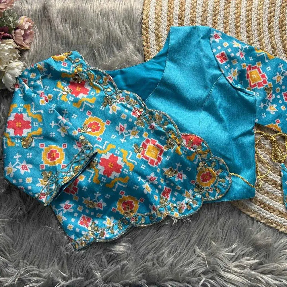 This elegant round neck designer blouse is crafted from luxurious silk fabric, ensuring a refined and sophisticated look.