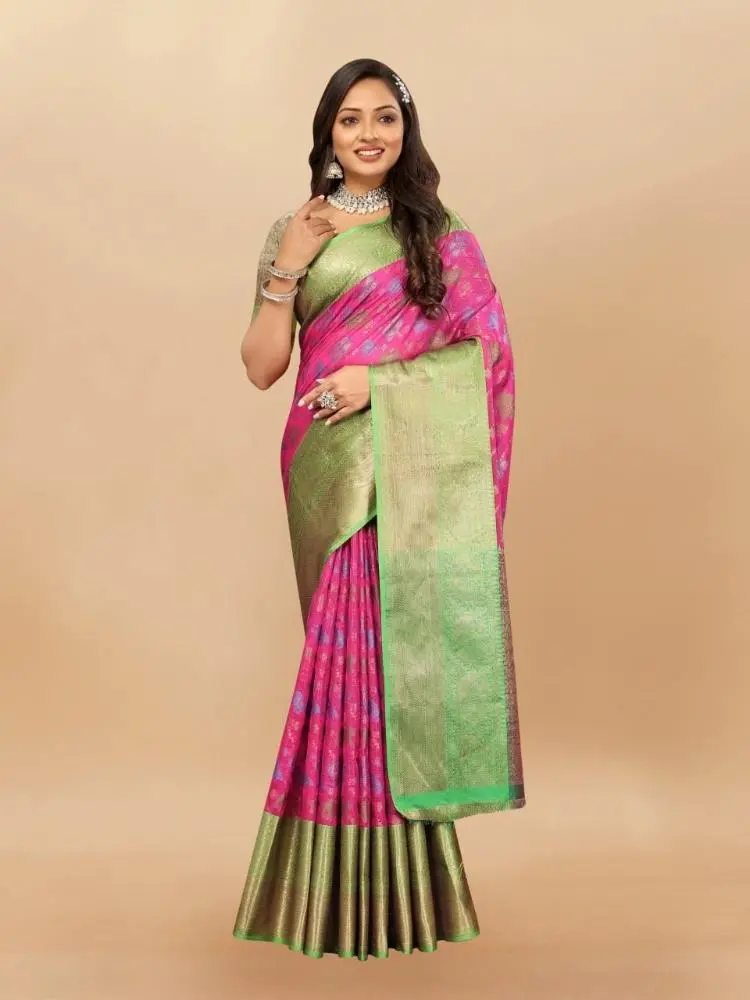 Discover timeless elegance in our Soft Cotton Saree, blending traditional craftsmanship with contemporary allure. Crafted from finest cotton, it drapes gracefully, complemented by intricate Meenakari work for vibrant appeal. The rich zari pallu adds a royal touch, while a contrasting border enhances its sophistication. Paired with a luxurious silk blouse, this ensemble promises to elevate your style at weddings, cultural events, or soirées, ensuring you shine with grace and sophistication.