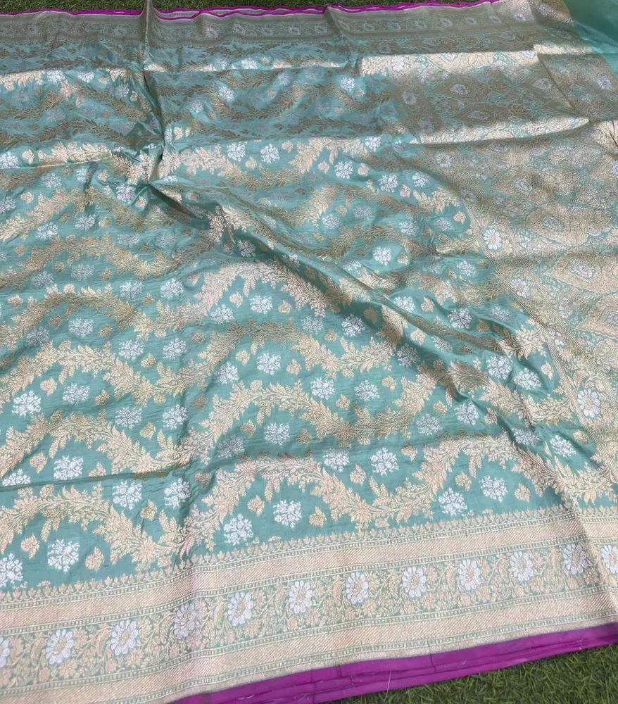 This exquisite pure Banarasi katan silk saree features a stunning teal base adorned with an intricate all-over pattern of delicate gold zari work.