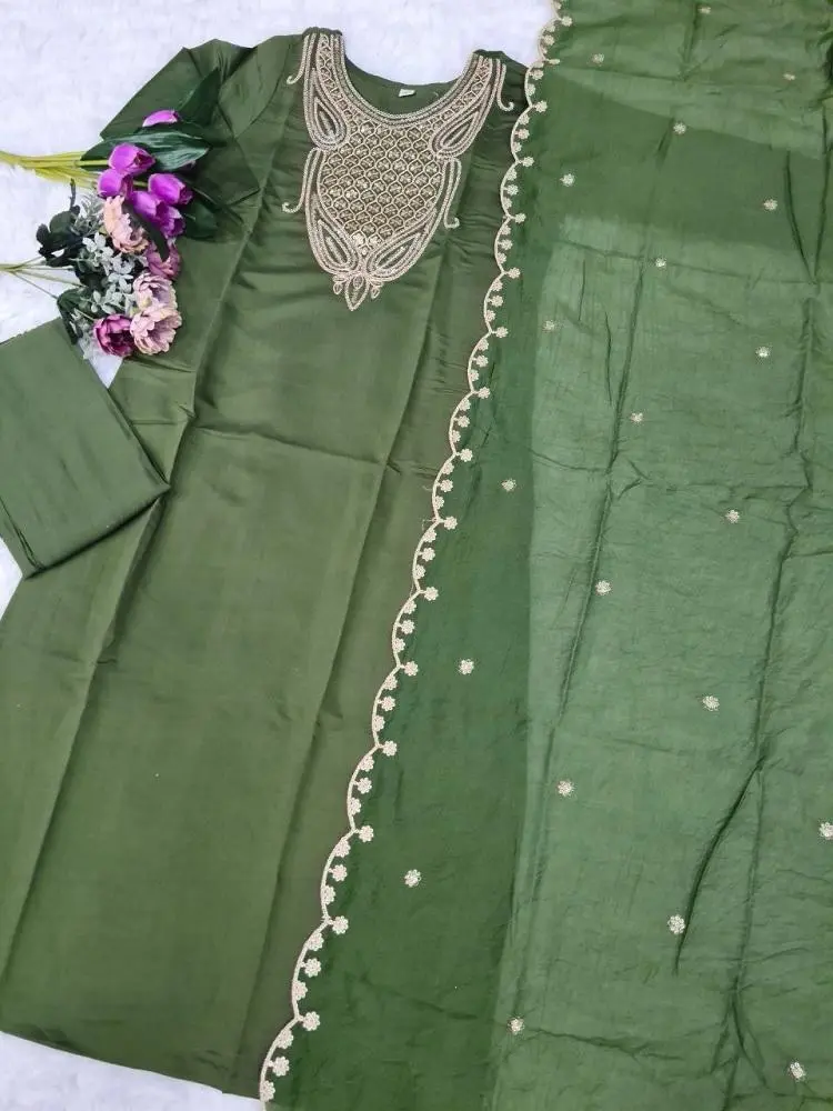 The kurti is paired with a silk dupatta in a complementary green hue, enhancing the overall grace of the outfit.