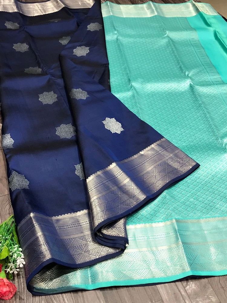 Enchanting Kanchipuram Silk Saree With Intricate Pallu And Crafted Blouse In Navy Blue Color Code : SOMSKPSK1700NB