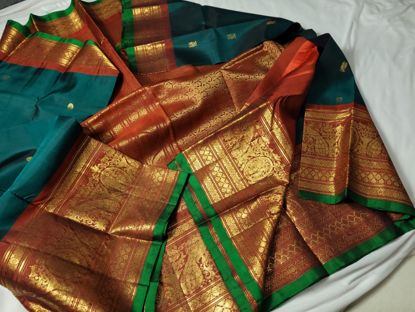 Exquisite Gadwal Pattu Saree With Kanchi Borders And Contrast Blouse In Dark Green Code : GOSPPGSK100DG