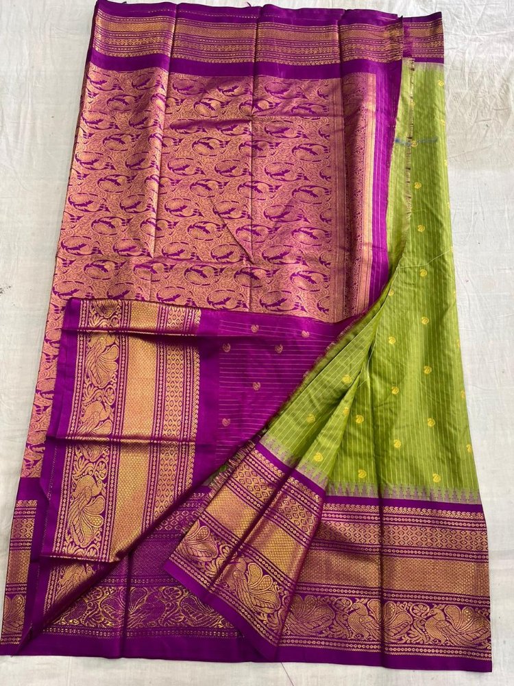 This handwoven Gadwal Pattu saree features stunning Kanchi borders and a meticulously crafted pallu.