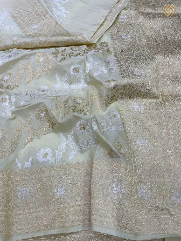 The body of the saree features a delicate ivory base, adorned with an all-over floral Jaal (network) pattern. The motifs include beautifully woven flowers, leaves, and vines, intricately designed with white and golden zari work. This creates a stunning contrast against the subtle background, giving the saree a ethereal and romantic quality.