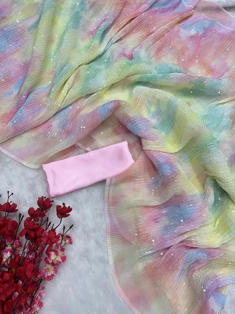 Embrace elegance with our stunning shaded georgette saree, featuring intricate sequin embroidery and delicate crush detailing. Perfect for special occasions, this ensemble blends tradition with modernity, exuding grace and sophistication to elevate your Indian ethnic wear collection. Shine with unparalleled charm and beauty in this exquisite attire.
