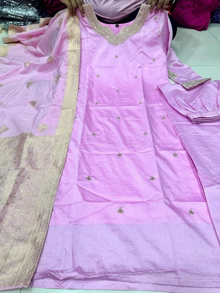 Step into elegance with this stunning Banana Silk kurti, pant, and Russian Silk dupatta set, perfect for festive occasions. The kurti features intricate zari and jacquard work with a smooth lining for added comfort and luxury. Available in sizes 38 to 46, this designer ensemble exudes sophistication while offering a timeless festive look.