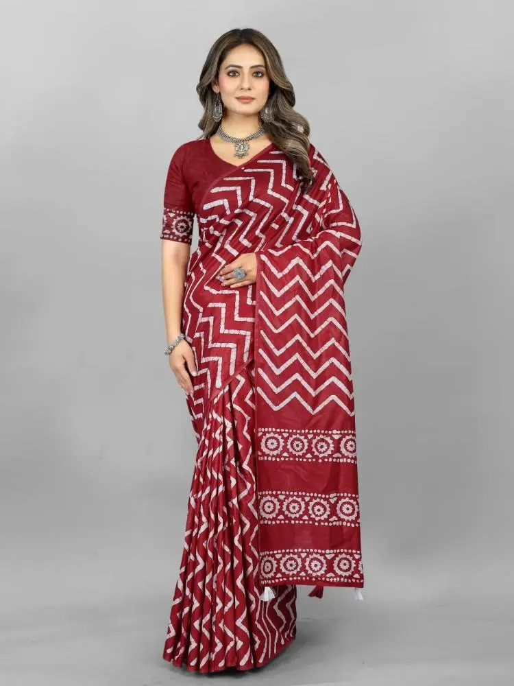 The Hand Wax Batik Saree with Printed Design is a beautifully crafted piece that highlights the art of traditional batik work.