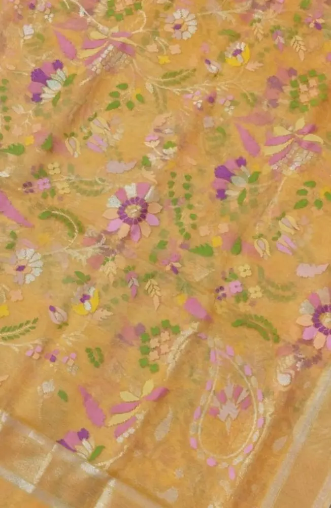 A breathtaking Banarasi Jamdani saree handwoven with "Nine Different Colours of Resham Threads" in beautiful Meenakari blossoms. A timeless and poetic Banarasi masterpiece on light and airy pure cotton.
