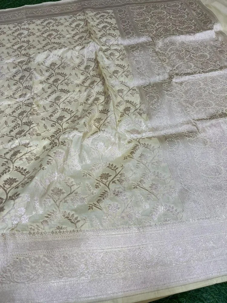 Discover the elegance of this new Benarasi pure Katan silk handloom saree, featuring a stunning cutwork weave and a richly designed pallu.