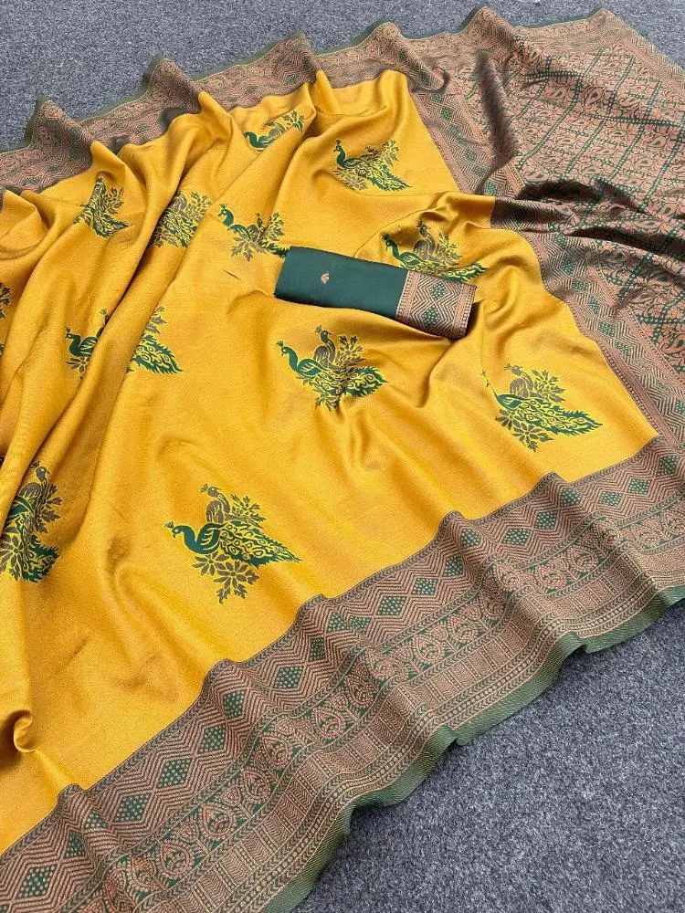 The rich texture of the Katan silk, combined with the stunning Jamewar patterns, showcases exquisite craftsmanship and attention to detail.