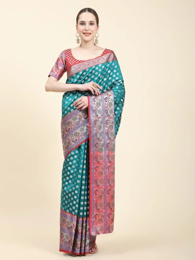 The rich contrast pallu enhances its grandeur, while the saree comes with a matching contrast blouse with a border.