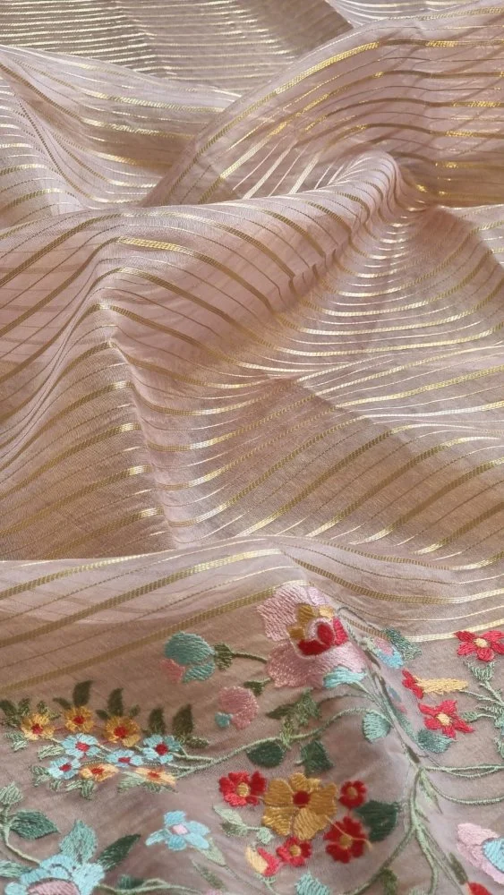 This elegant pure organza silk saree features delicate handwoven floral embroidery and luxurious velvet lace trim.