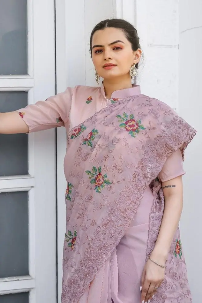 This exquisite pure shiny zari chiffon saree features intricate cross-stitch floral embroidery and cutwork throughout.