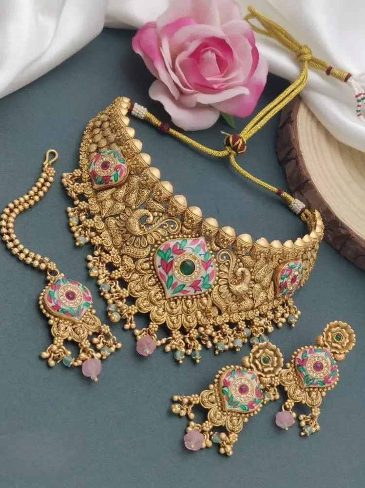 Opulent Harmony: Golden Choker Necklace With Earrings And Tickle Code : YNJWCK2003GD