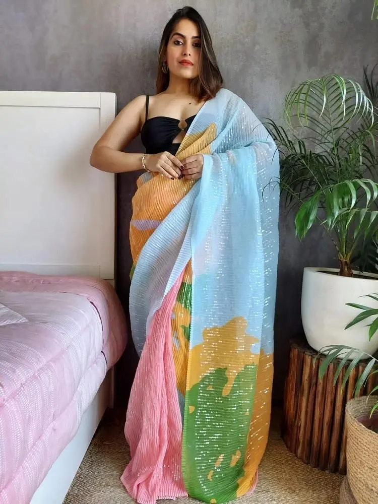 Imagine a saree that combines the airy elegance of georgette with the rich opulence of Pehnava silk. This exquisite creation drapes beautifully, showcasing the lustrous sheen of Pehnava silk, a fabric known for its smooth texture and vibrant colors.