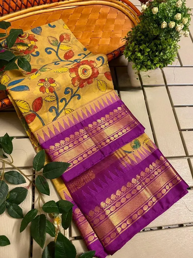 Pure Gadwal Printed Saree In Yellow And Purple Code : MMSRSPGD1003