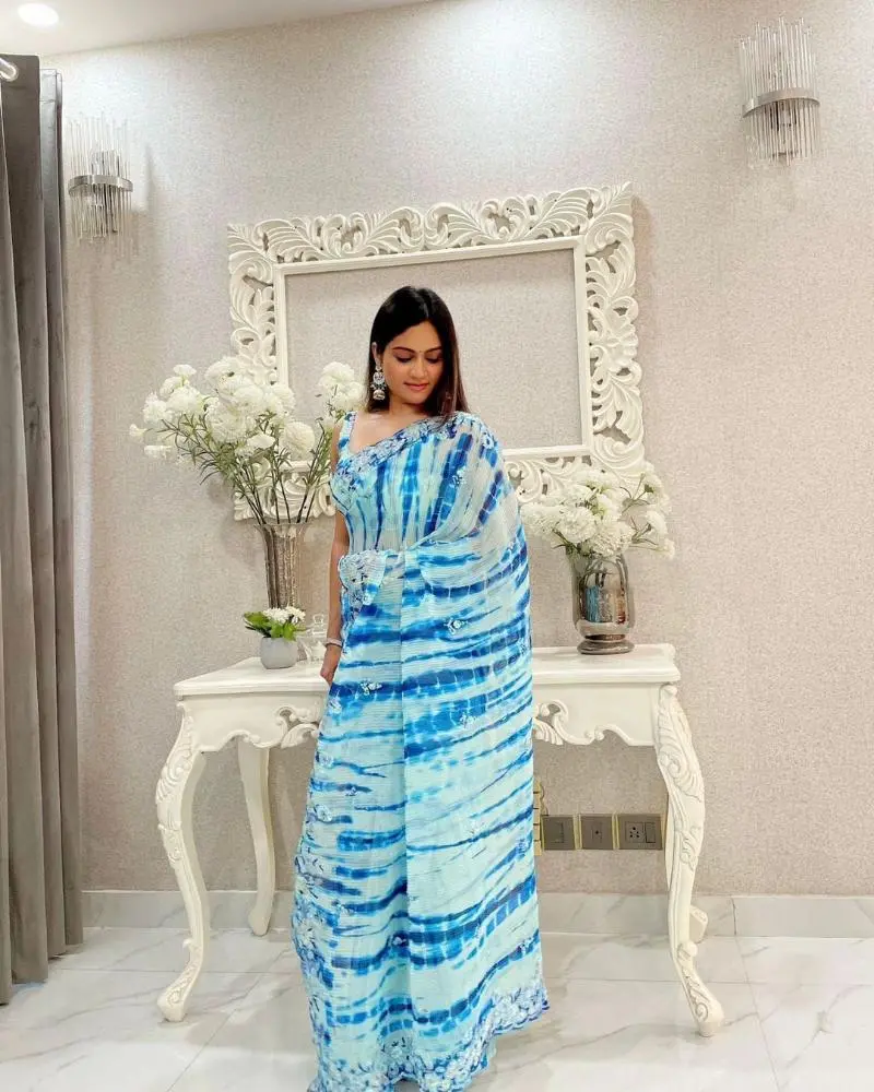 Imagine a saree that drapes like a dream, crafted from the softest pure georgette. This exquisite piece stuns with a two-toned shaded effect, where colors seamlessly blend into one another. The result is an ombre masterpiece, creating an aura of elegance that flatters any silhouette.
