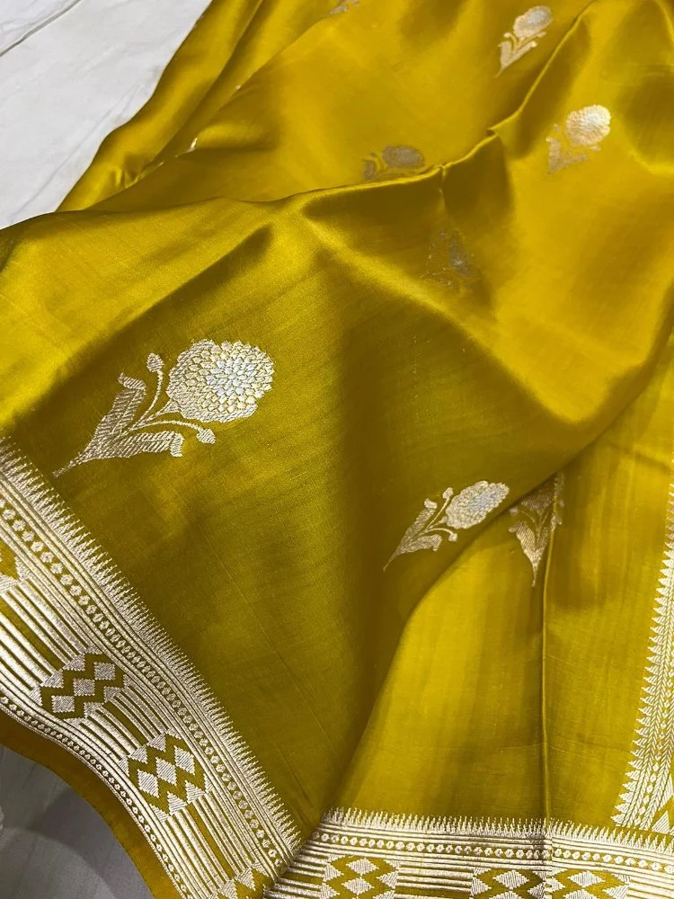 This elegant pure Banarasi Katan Satin Mashru silk saree features allover Kadhuwa weave booties, adding a touch of sophistication to your wardrobe.