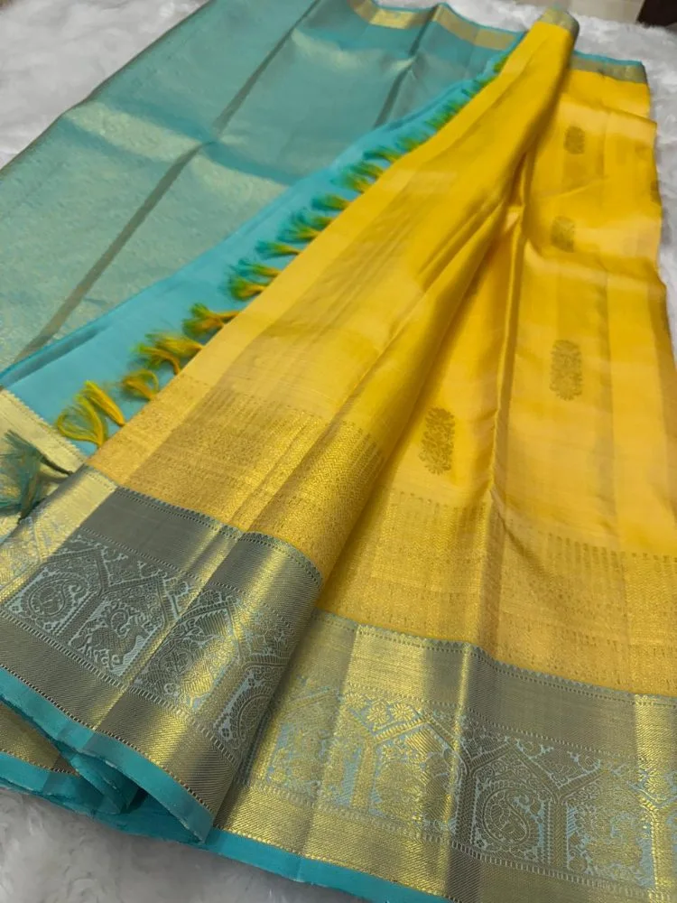 Pure Silk Handloom Kanchipuram Saree With Regal Pallu Accents In Yellow Code : SOMSKPSK100YL2