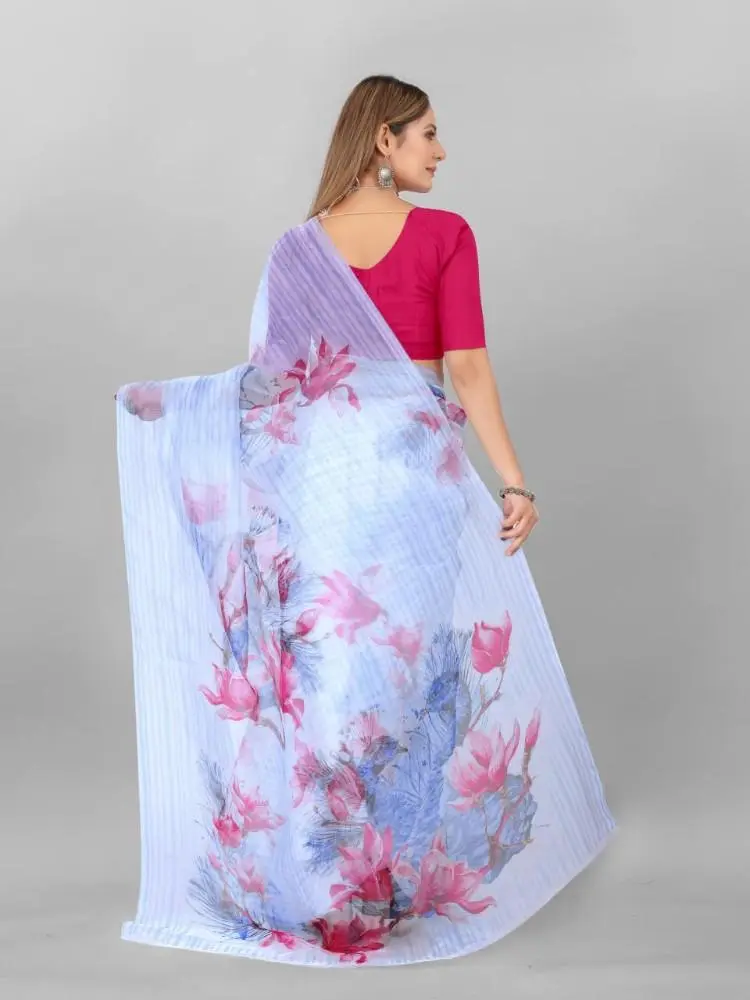 The Organza Silk Saree features a lightweight and airy fabric with a delicate sheen, offering a graceful and elegant drape.
