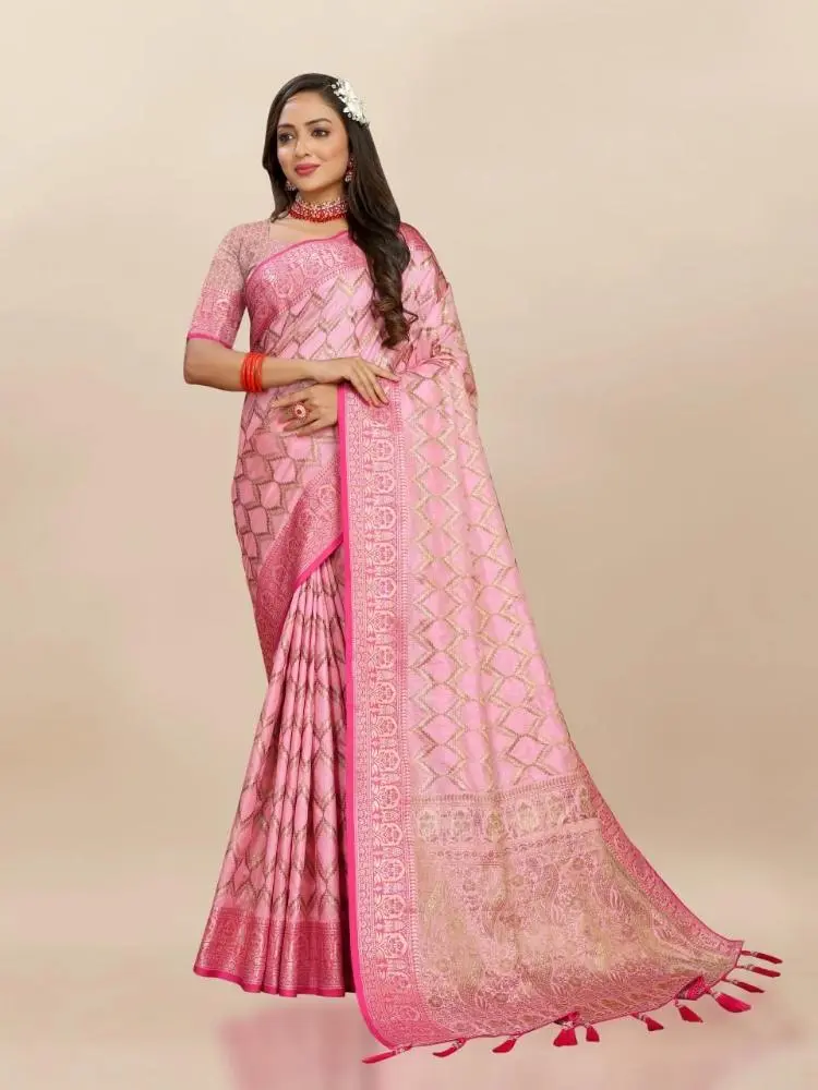 Embrace regal splendor with our Soft Katan Silk Saree, distinguished by its wide zari border that exudes grandeur.