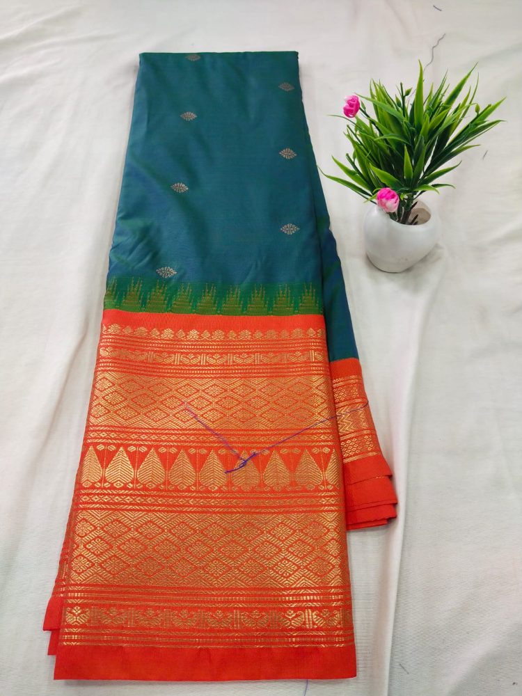 Crafted with semi Gadwal silk fabric, it features intricate zari weaving and elegant borders.