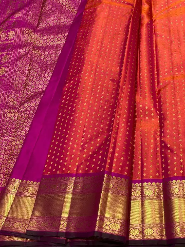 Zorimon presents an exquisite array of Pure Kanchipuram Handloom Silk Sarees, each a masterpiece of traditional craftsmanship and contemporary allure. Each saree is adorned with delicate 2 gram pure zari buttas, scattered like golden blossoms across the lustrous silk, creating a mesmerizing play of light and texture.