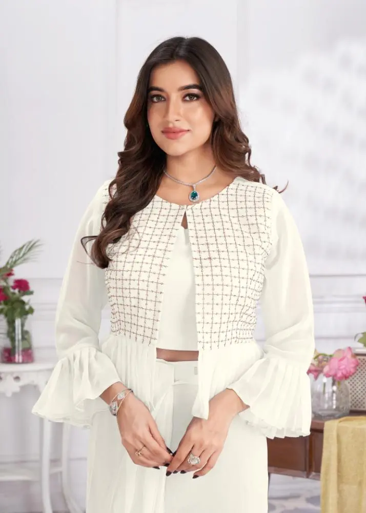 Ready-to-wear saree with a stitched blouse featuring embroidery, sequins, and a stitched pallu.