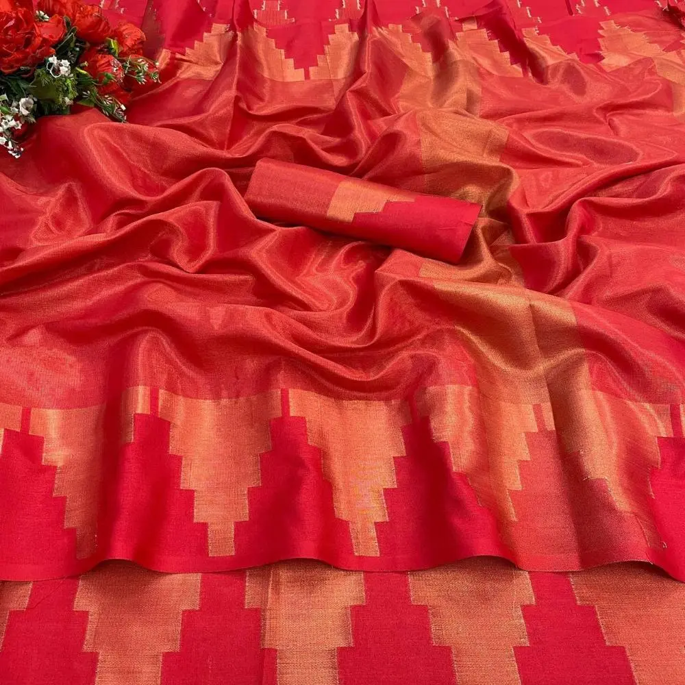 Adorned with intricate Copper Zari Weaving, this saree radiates a rich, lustrous appeal, making it perfect for special occasions and festive events.