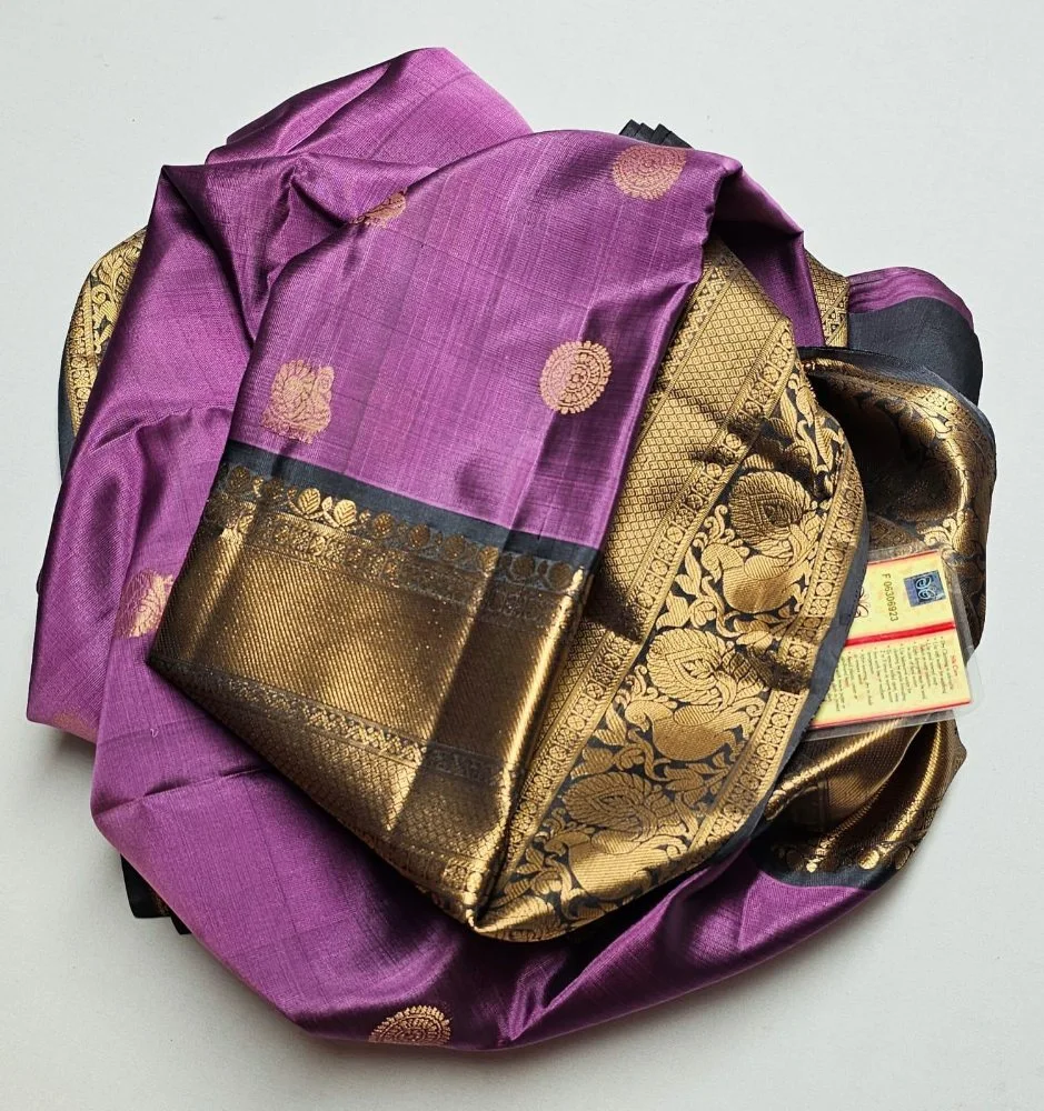 Discover the elegance of this pure handloom double warp Kanchi silk saree, crafted with 100% first-quality silk and adorned with intricate silver and gold zari work.